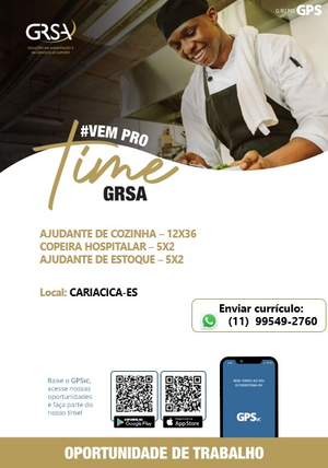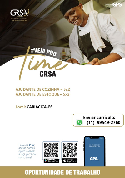 A empresa GRSA SOLUÇÕES EM ALIMENTAÇÃO e EM SERVIÇOS DE SUPORTE localizada em Cariacica/ ES está contratando Ajudante de Cozinha