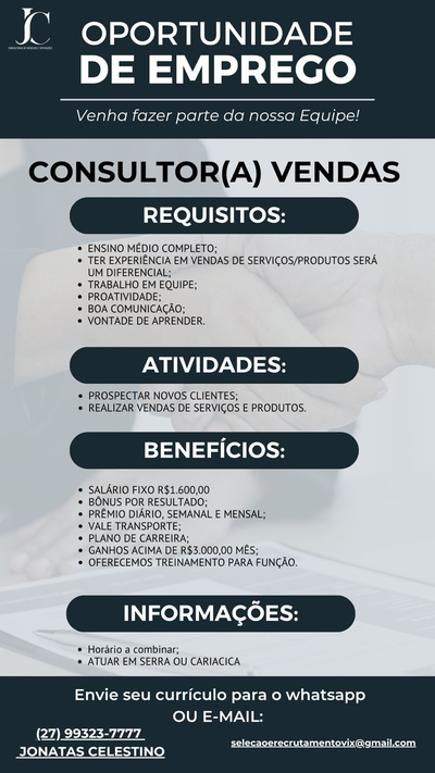 TER EXPERIÊNCIA EM VENDAS DE SERVIÇOS/PRODUTOS SERÁ UM DIFERENCIAL