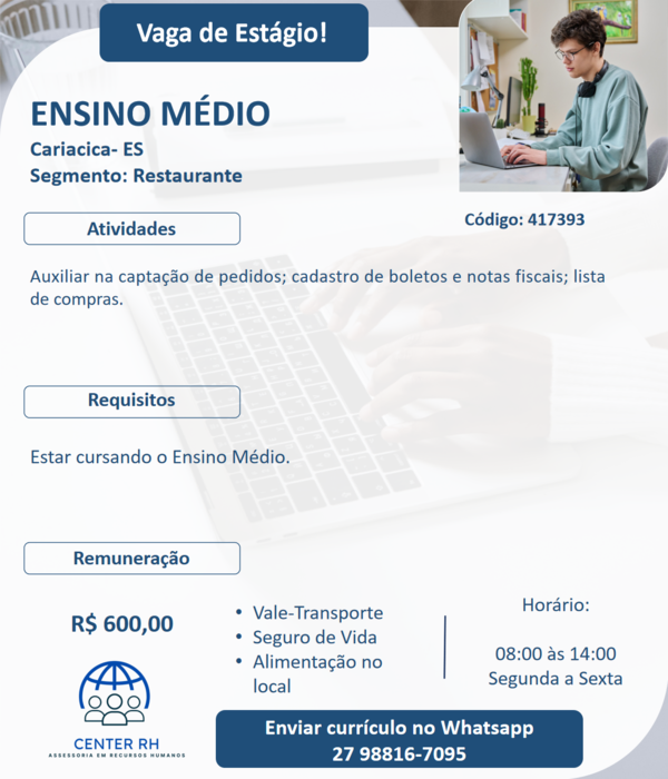 Remuneração: R$ 600,00 + Vale-Transporte + Alimentação no local.