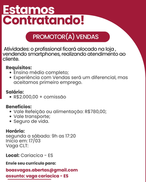 Experiência com Vendas será um diferencial, mas aceitamos primeiro emprego.
