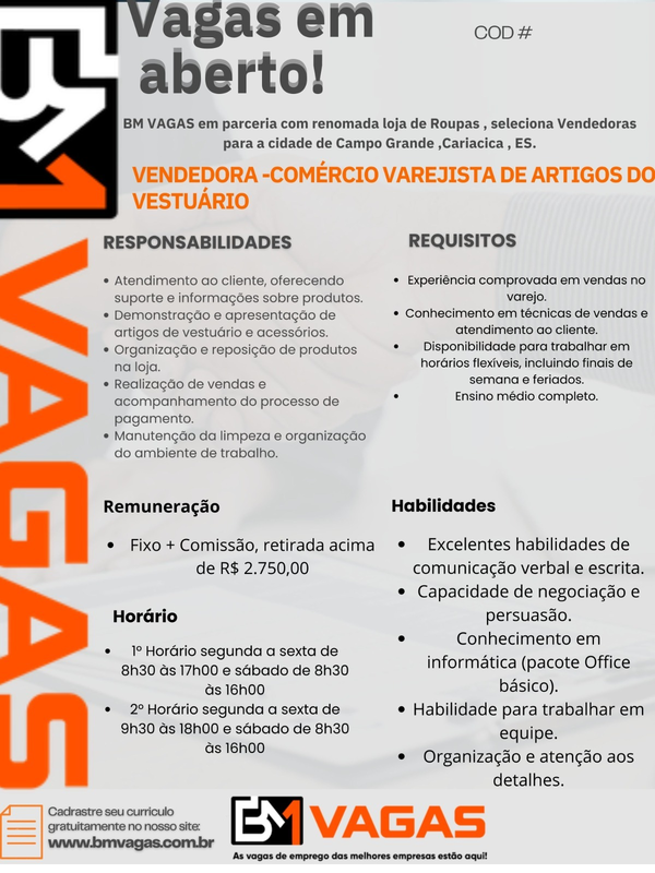 BM VAGAS em parceria com renomada loja de Roupas, seleciona Vendedoras para a cidade de Cariacica/ES.